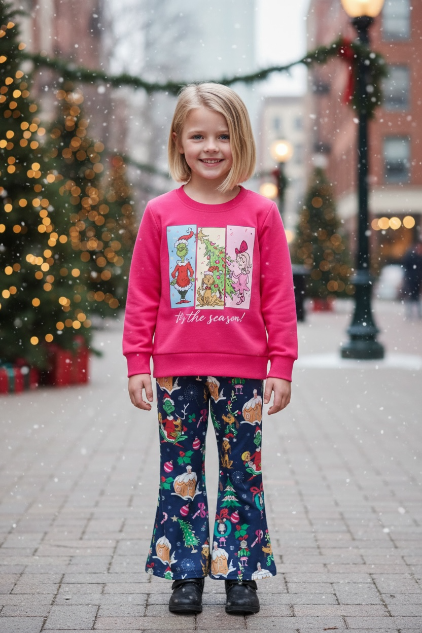 Get cozy and festive with the playful beloved character! The soft sweatshirt features a vibrant, classic design, complete with his mischievous grin and signature green color, perfect for holiday fun. Matching pants carry the theme forward with complementary patterns--think candy canes and snowy accents. Ideal for lounging at home, holiday movie marathons, or family photos, this set combines comfort, cheer and a touch of mischief.