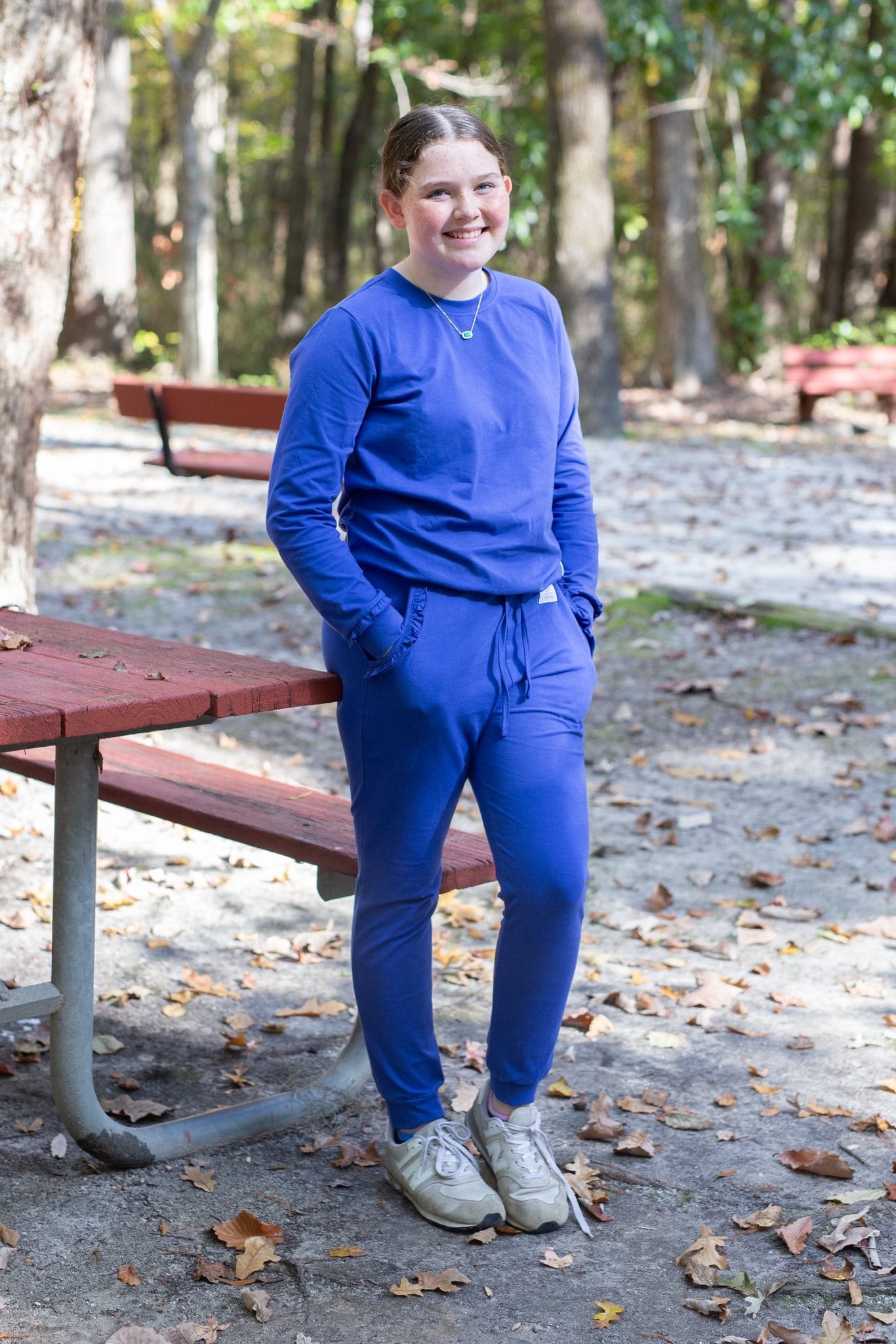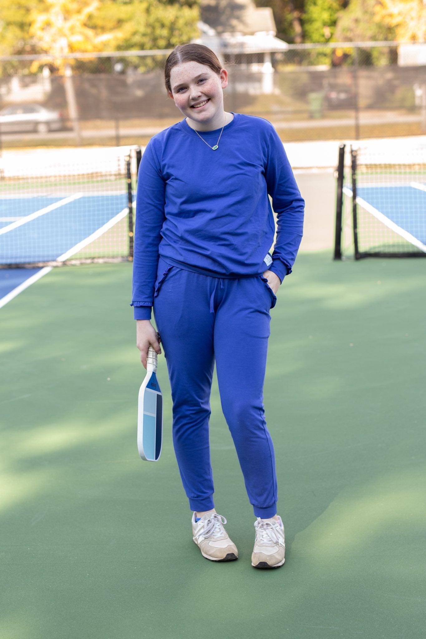 Cutest ruffled sweat set! Comes in blue or green! Perfect for lounging or those cool Fall/Winter days at school!